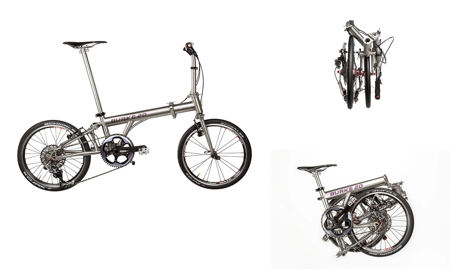 Designed for taking on travels by plane, boat or train, the Burke 20 can be folded and packed into a 28"x22"x12" suitcase in one minute, without disassembly of wheels, handlebar or use of tools. Unfolded, the 20-inch wheels, wide gear range, and a full titanium frame with an extended cockpit give a fast and reassuring ride.